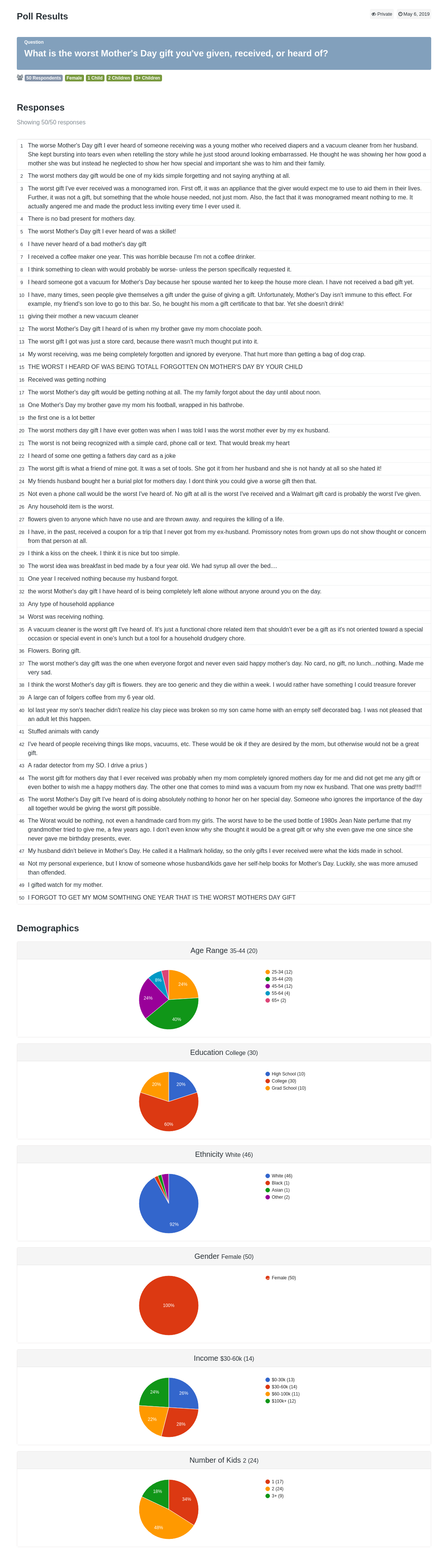 50 US-based respondentsWomen Parents of 2 childrenMay 6, 2019Private