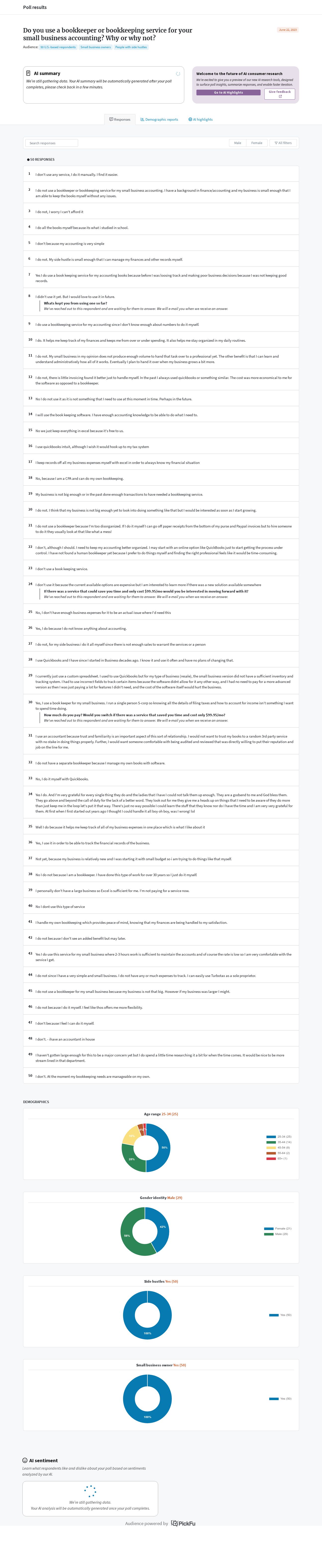 Overall, it seems that small business owners have varying reasons for not using a bookkeeper or bookkeeping service. The most common themes include personal knowledge and experience with accounting, simplicity of accounting needs, cost concerns, and personal preference for handling finances independently. It would be interesting to further test these hypotheses by exploring whether certain demographics (such as age or industry) are more likely to use a bookkeeper/service than others based on these factors. Additionally, it may be worthwhile to investigate whether those who do use a service are more likely to report higher levels of satisfaction with their financial management compared to those who do not use one at all.