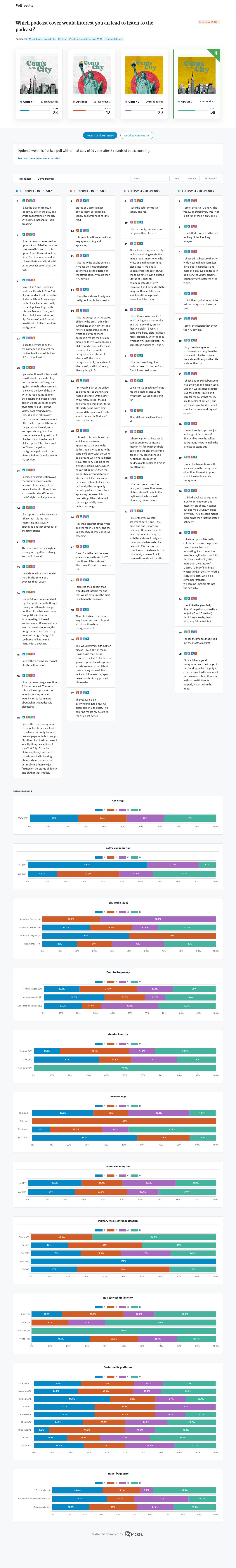 Unearth more insights with a detailed poll report, discovering what respondents liked, disliked, and what to do next.Aesthetic Appeal: Across both options, aesthetics were crucial in influencing preferences. Participants often referred to colors and overall design quality when justifying their choices.