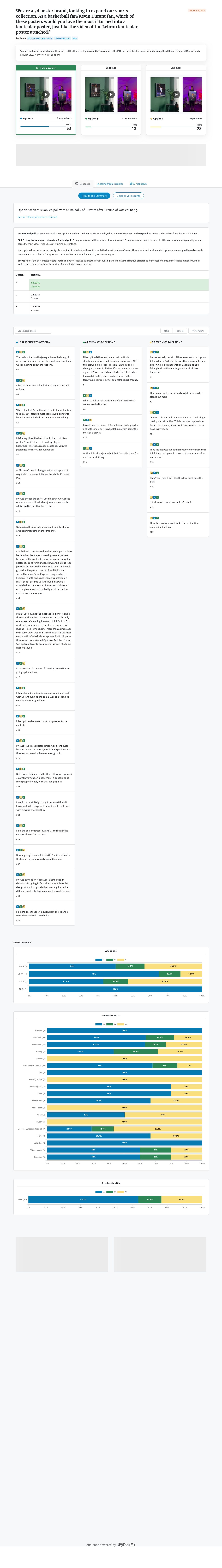 Option A emerged as the clear winner, primarily due to its dynamic dunk pose and vibrant blue jersey, which respondents found visually striking and reminiscent of iconic basketball moments. The top three themes influencing preferences were the action-oriented nature of the pose, color contrast provided by the jersey, and how well these elements translated into a lenticular format. Option C was appreciated for its active pose but lacked the visual impact of Option A. Option B's shooting motion resonated with some fans but was generally perceived as less exciting compared to dunking imagery.