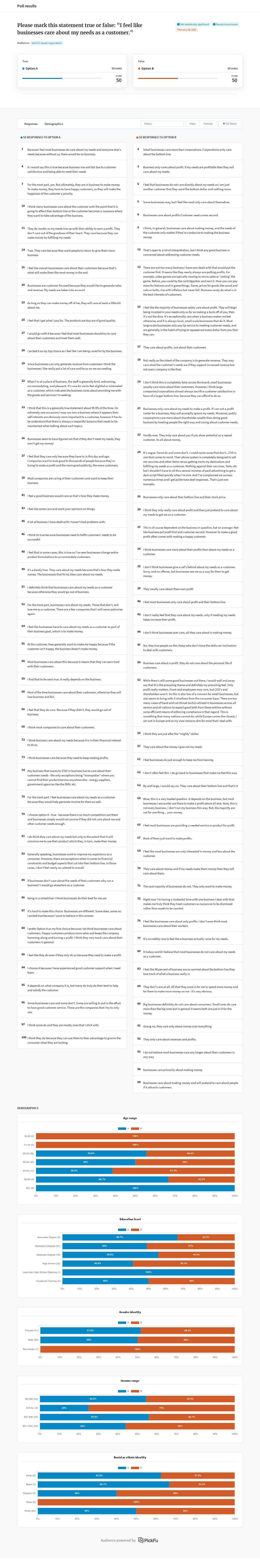 Q: Please mark this statement true or false: "I feel like businesses care about my needs as a customer."
