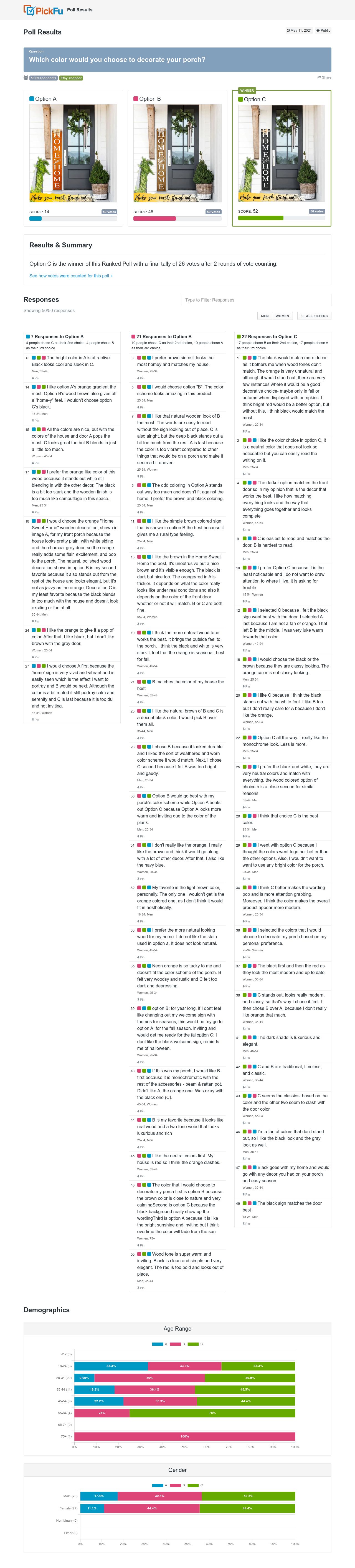 Unearth more insights with a detailed poll report, discovering what respondents liked, disliked, and what to do next.Aesthetic Appeal: Across both options, aesthetics were crucial in influencing preferences. Participants often referred to colors and overall design quality when justifying their choices.