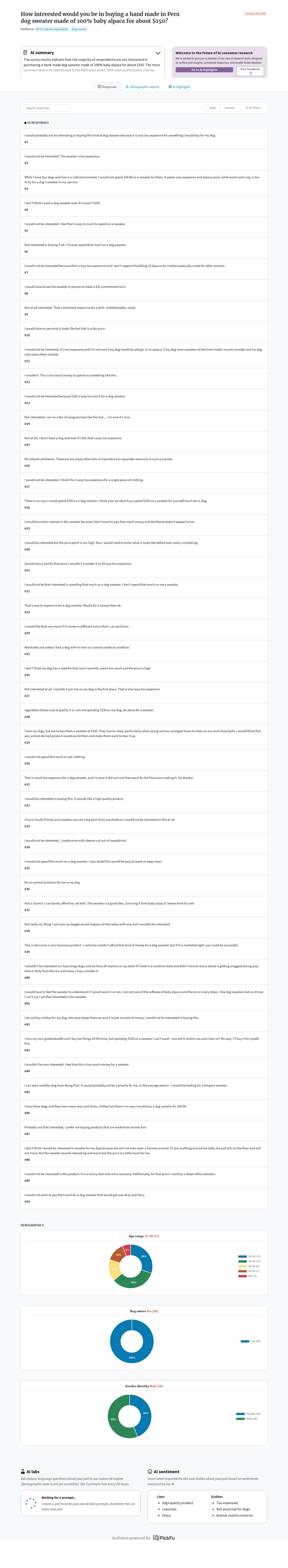 The survey results indicate that the majority of respondents are not interested in purchasing a hand-made dog sweater made of 100% baby alpaca for about $150. The most common reason for disinterest is the high price point, with many participants stating that they would not spend that much money on a single piece of clothing, especially for their pets. Some respondents also expressed concerns about the use of animal products and questioned the necessity of such a luxurious item for their dogs. Additionally, practicality played a role in influencing their decision, as some mentioned potential issues with washing and durability.