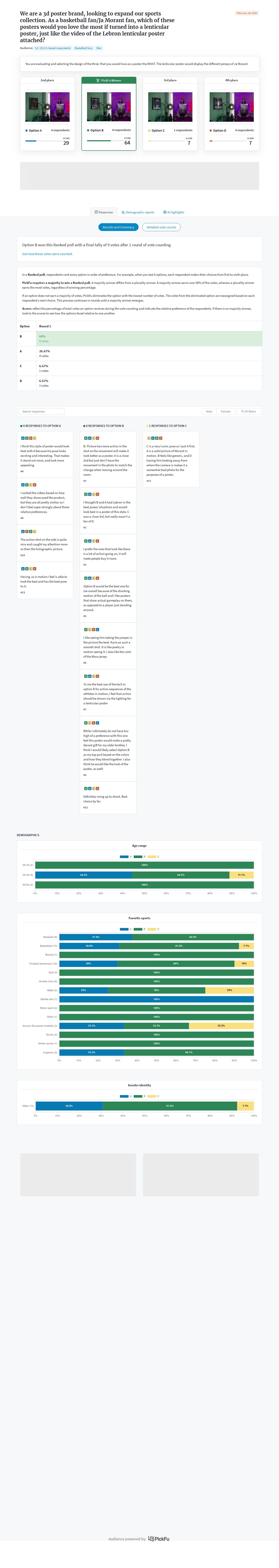 Unearth more insights with a detailed poll report, discovering what respondents liked, disliked, and what to do next.Aesthetic Appeal: Across both options, aesthetics were crucial in influencing preferences. Participants often referred to colors and overall design quality when justifying their choices.
